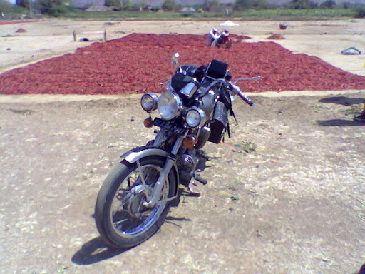 lace we found lots and lots of red chillies drying at the fields. So we all stopped for some photo shoots, but jhonny and nishant were more interested in some fresh chillies right from the field. So I think they got around 2 kgs of dried red chillies. Around 85 kms before Sri Salem comes a Hillock very peculiar in shape, like a gumbat of a temple or something. From the road only one can get a commanding view of it. A small photo stop. On the way Jhonny also gave a life to a localite, who lived around 40 kms before Sir – Salem. It sure was hot and I could feel the heat burning my head, but didn’tknew what was store for me next.