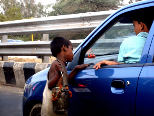 Common scene on Delhi Roads. But you can easily make out that kid is least interested in begging. Instead he is more interested in the life or you can say the different world inside the car. Shot taken at Dhaula Kuan , New Delhi