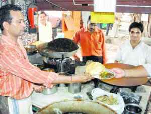 The chholey came with a dollop of green chutney, with a green chilli pickle and a sour mango pickle on the side. The bhatureys were stuffed with paneer, giving the crispy bread a soft touch. One plate, consisting of a good helping of chholey and two hot bhaturey, comes for Rs.18.