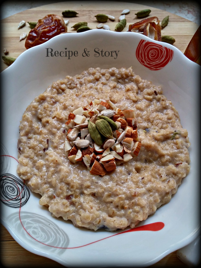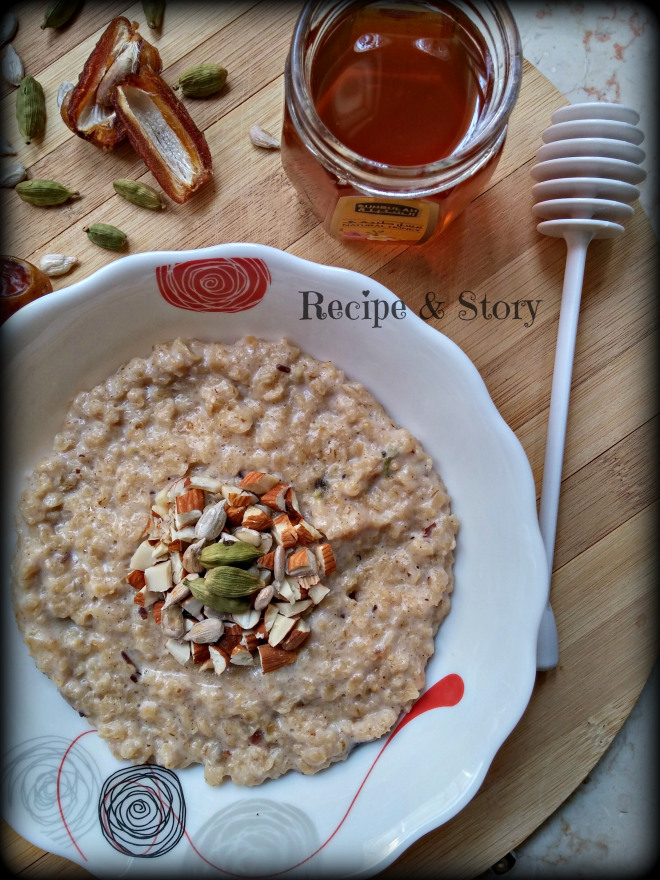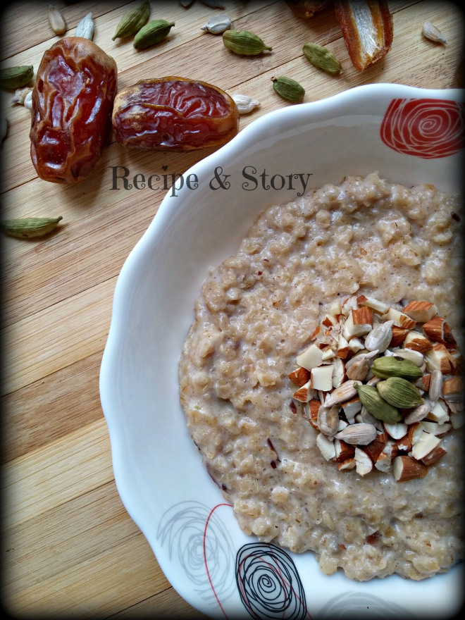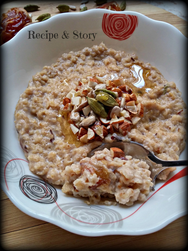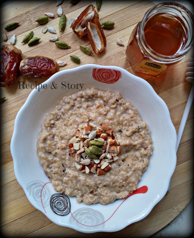 Adding flavors and ingredients is the best thing you can do with your morning oatmeal. My cousin suggested making oatmeal with nutmeg and chopped dates (mixed & cooked with it rather than added on top). I liked the idea and decided to go on and create a new flavored oatmeal. Then I thought about adding more flavors to it like cardamom, saffron and ground ginger.