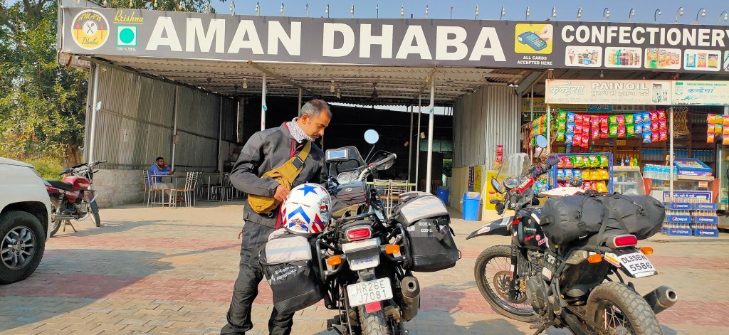 Captains log started on 9th Oct 2020, RV for start was opposite Suncity at 0530 hrs but Shridher got delayed by 30 min hence we kick started at 0605 hrs .The nip was in the air and the feeling of riding in the nice cool breeze was elevating. Karnal byepass was crossed in less than an hour and we were now zipping on NH1 which had by now swelled up with traffic. We meandered our way through and stopped for breakfast at Aman Dhaba near Sonipat. Post a light meal comprising of butter toasts and tea we resumed our journey. It was now around 4 pm and we were nearing Swarghat after intercepting a farmers agitation near Ropar which delayed us by good 45 minutes. It also coincided with my RE riding boots tearing open (probably due to non usage for long). Paid Rs 120/ to get the wide open lips of my boots stitched together as I had no other option available. Since we were in no hurry to reach Manali, we decided to anchor at the Hilltop Hotel at around 1600 hrs.. What followed was a small stroll through the local market where we picked 2 cans of Budweiser to celebrate day 1 of the ride . Dinner comprised of Chicken Rarha and we hit the bed early.