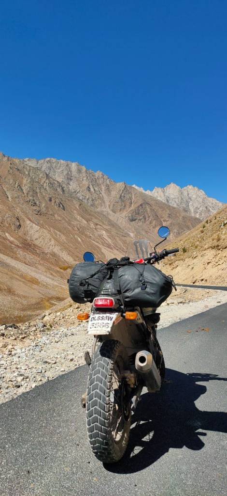 We were feeling absolutely heavenly riding through this work of art at 10,000 ft stretching at 9.02 kms. We soon passed through the tunnel and steered our way towards Sissu. The ride on the newly constructed road through Tandi , Keylong , Jispa and Darcha was a sheer pleasure where we zipped past 80 Kmph on the odo. We took a well deserved halt at Darcha over momos and thukpa after getting ourselves registered at the Darcha Police Post. The next 2 hrs of ride from Darcha to Shingo La was not only arduous but challenging. The stretch is about 40 kms which winds through gravel, rocks and dry patches. The turns are sharp and some of them hair pin tight . Maintaining momentum acquires significance or it becomes very tough waddling the bike up hill with depleted oxygen levels.
